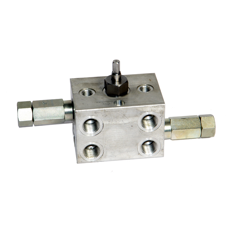 The valve type V.B.P.A.-50 is a special valve which includes both the bypass valve and the antishock valve. This block is mainly used for systems with two hydraulic cylinders since the valve has four plugs on each side.